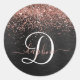 Personnalisez facilement ce design élégant d'autocollant rond à la mode avec une jolie parties scintillant brillante en or rose sur un arrière - plan métallique brossé noir.