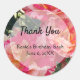 Un autocollant élégant avec des roses rayées roses et blanches qui s'épanouissent dans cette photographie florale d'art raffiné, avec Merci en lettres cursives, et place pour plus d'informations en lettres majuscules vintage sur un fond translucide.