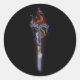 Un dragon rouge audacieux perche au-dessus d'une épée, dressé contre un arrière - plan noir profond