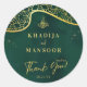 Stickers Royal Emerald Green Gold Parties scintillant Mariage Merci Classic rond. Ce petit autocollant rond est un véritable showstopper ! Il a un riche arrière - plan vert émeraude avec de beaux détails de parties scintillant dorée, lui donnant une touche d'élégance. L'autocollant commence par 'Bismillah,' un salut islamique spécial, suivi des noms du couple de manière élégante. Nous avons ajouté "Lots of Love" et "Merci" parce que nous vous apprécions vraiment d'être là. La date de notre mariage est également subtilement incluse. Ces autocollants sont parfaits pour ajouter une touche d'élégance aux faveurs de mariage comme les enveloppes ou les cadeaux.