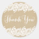 Les autocollants de mariage en forme ronde sont dotés de "Merci" en écriture, d'une charmante conception de bordure illustrée de dentelle blanche fleurie et pointillée, et d'un arrière - plan à l'aspect texturé de papier kraft rustique brun.