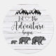 Famille d'ours de marche rustique laisser l'aventure commencer baby shower autocollants, sur un arrière - plan en bois. Calligraphie avec coeur.