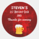 Merci autocollant pour une fête d'anniversaire. L'arrière - plan est un arrière - plan de texture peinte de style grunge rouge profond avec des coups de pinceau épais, des raclettes et des rayures. Un bonbon de couleur rouge vif superposé sur une couleur rouge rubis foncé. Une illustration d'une tasse de bière mousseuse est placée sous le texte.