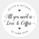Un Sticker Mariage classique en Merci noir avec "Tout ce dont vous avez besoin, c'est de l'amour et du café" dans une calligraphie de police moderne et rustique. Vous pouvez facilement le personnaliser avec vos noms et date mariage.