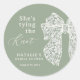 Élevez votre fête de Shower Nuptial avec cet autocollant rond classique élégant Sage Script Bow Elle Se Marie Shower Nuptial