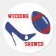 Baguettes de sceau sur le thème du football amusant. Fait en rond, avec un arrière - plan blanc et des graphismes d'un football rouge et bleu se faire taper avec un élégant talon bleu stiletto. Le texte rouge indique le Wedding shower. Personnalisez le texte de votre événement.