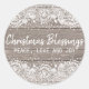 Très joli autocollant rustique commence avec un arrière - plan en planque de bois clair. La dentelle blanche et les petites étoiles blanches créent une bordure supérieure et inférieure. Les Bénédictions de Noël sont écrites dans le centre avec Paix, Amour et Joie juste en dessous. Vous pouvez facilement modifier le texte pour inclure vos propres salutations et bénédictions.