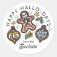 Cet autocollant "This Happy Hallo-days" est une façon amusante de réunir Halloween et Noël dans un seul motif de fête. L'illustration combine des détails effrayants d'Halloween comme des crânes, des fantômes et un biscuit au gingembre décoré de glaçage squelette avec des éléments classiques de Noël tels que des ornements et des couleurs de fêtes. Personnalisez-le avec votre nom ou le nom de votre famille pour le rendre unique. Cet autocollant rond est parfait pour sceller des enveloppes, ajouter une touche spéciale à vos cartes de fêtes ou l'utiliser comme étiquette-cadeau unique pendant la saison.