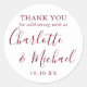 Symbole de mariage en Bourgogne merci l'autocollant rond classique avec des noms de style signature. Personnalisez avec vos informations de remerciement spéciales dans la typographie chic bordeaux. Conçu par Thisisnotme©
