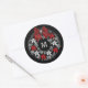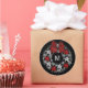 Monogrammed sticker for toxiques, enveloppe ou baked goods with a silver and red holiday wreath on black and soft snowfall.