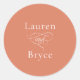 Avec une simplicité moderne et une ambiance d'agrumes ensoleillée, ce design mariage minimaliste présente un style moderne classique en lettres blanches sur un arrière - plan orange d'agrumes audacieux avec élément calligraphique élégant qui épingle le mot "et" dans l'atmosphère moderne. Personnalisez le modèle de texte avec les noms de la mariée et du marié pour un autocollant mariage polyvalent qui a tant d'usages. Utilisez-les comme scellés d'enveloppe sur vos invitations de mariage, ou comme étiquettes de faveur ou étiquettes pour les faveurs de mariage. Parfait pour les mariages au printemps et en été, ou sur le thème des agrumes méditerranéens.