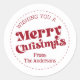 Un autocollant moderne et rétro simple qui dit "Joyeux Noël" dans une police rétro tendance. Le nom en bas est un modèle qui peut être changé pour convenir à votre famille, à votre entreprise ou à tout autre dicton que vous voudriez.