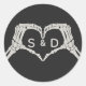 Améliorez votre décor mariage avec notre Sticker Rond Coeur Skeleton, idéal pour sceller des enveloppes ou des faveurs de mariage avec une touche d'élégance gothique. Cet autocollant circulaire présente des mains squelettiques finement conçues formant un coeur, avec de l'espace au centre pour vos initiales, ajoutant une touche personnalisée et pointue à votre journée spéciale.