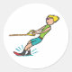 La conception du ski nautique montre skieur sur un seul ski nautique coupant à travers l'eau. Se penche dans la corde de remorquage, porte du matériel de ski et des nuances, souffle de cheveux avec la vitesse du vent. Graphique ludique et original pour skieurs et amateurs d'eau.