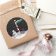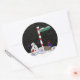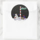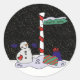 Le bonhomme de neige est habillé de gants et de boutons bleus. Le bonhomme de neige est debout à côté d'un poteau blanc et rouge avec un signe vert qui dit "pôle Nord". Les cadeaux sont à côté du pôle. De la neige blanche est posée sur le sol. Les autocollants sont disponibles avec un dossier blanc ou noir.