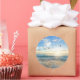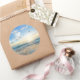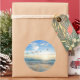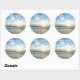 Cet autocollant montre une magnifique scène de plage, avec des mouettes volant au-dessus de la plage et de l'océan.