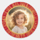 Des autocollants photo avec votre photo à l'intérieur d'une image imprimée d'une bordure de soleil en dégradé doré sur un arrière - plan rouge.