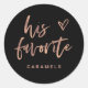 Cette étiquette de faveur simple et élégante conviendra parfaitement à votre mariage moderne ! Le script décontracté manuscrit en or rose, tendance, dit "son préféré", ainsi qu'un élégant coeur dessiné sur un arrière - plan noir foncé. Il y a un endroit pour ajouter le type de gâteau préféré du marié.