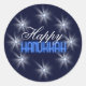 Cette belle conception autocollante présente huit étoiles brillantes de David dans un tableau autour du texte 'Happy Hanoukka'. L'Arrière - plan est bleu nuit, entouré d'étoiles blanches brillantes.