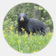 Image d'un ours noir dans un champ de pissenlits jaunes sur un autocollant rond.