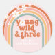 Autocollants super Young Wild et Three 3ème anniversaire de style rétro avec arc-en-ciel hippie, marguerites et polices et couleurs boho.