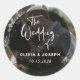 Ces autocollants de mariage modernes et élégants disposent de votre propre photo personnelle couvrant complètement l'arrière - plan. Une incrustation circulaire noire contient une typographie de script à la mode blanche.