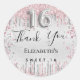 Moderne, élégant et glamour pour une fête de 16 ans Sweet pour une fille. Un arrière - plan faux argenté, décoré de poussière de parties scintillant rose et faux argent. Personnalisez et un nom. Avec le texte : Merci. Le numéro 16 est écrit avec une police de style ballon, script.