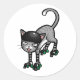 Doté d'une table en argent de dessin animé portant 2 paires de roller-skates, chaussettes rayées noir et blanc et d'un casque de sécurité.