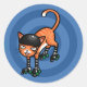 Doté d'une table caricaturale orange portant 2 paires de rollers, de chaussettes rayées en noir et blanc et d'un casque de sécurité sur un arrière - plan cible en cercle bleu.