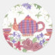 Un tableau aquarelle d'une table pour le thé avec un set de thé en plastique et de jolies fleurs lumineuses.