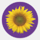 Autocollant rond tendance avec une image de fleur de soleil jaune vif posée sur un arrière - plan violet. Idéal pour ajouter la touche finale à vos lettres ou cadeaux.