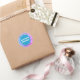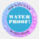 Sticker "Water Proof" en texte blanc en gras en cercle bleu avec eau bleue et violet laisse arrière - plan. Comprend deux lignes de texte supplémentaires : Made In The U.S.A. et nom. Personnalisez le message et la photo selon vos besoins. Placer sur les colis, etc.