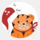 Un mignon tigre de dessin animé planté dans un chapeau de santa rouge avec des flocons de neige blancs. Un arc de fête rouge autour du cou.