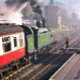 Un train à vapeur magnifiquement restauré et des chariots d'une époque révolue quittant la gare et le conducteur du moteur passe la clé avant d'être autorisé à continuer le long du chemin de fer. Angleterre Royaume-Uni.