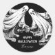 Autocollant effrayant pour une fête d'Halloween avec un fantôme noir et blanc.