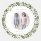 Jolie couronne de pin rustique et de fleurs blanches peintes avec photo en cercle central et texte personnalisable très joyeux avec votre nom.