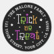 Étiquettes d'adresse de retour d'Halloween arrondies avec le texte : "Trick or traiter" en lettres blanches, orange vert et violet entourées d'étoiles, et champs de modèle personnalisables pour votre nom et adresse.