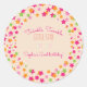 Les autocollants ronds de la fête d'anniversaire de cet enfant présentent un thème Twinkle Twinkle Little Star accentué par des étoiles de confettis rose, orange et vert brillant.