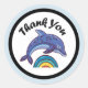 Un autocollant de remerciement avec une jolie illustration d'un dauphin bleu qui saute et qui vole sur un arc-en-ciel lunatique.