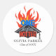 Fun et moderne fête de graduation faveur autocollant avec une illustration d'une casquette flamboyante de graduation. Le texte dit "un degré plus chaud".