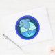 Illustration d'un mignon dauphin sautant de l'océan dans les tons bleu et vert. Sticker a une large bordure en bleu avec un motif ondulé dans des tons différents de bleu.