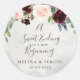 Complimentez votre événement mariage rustique avec cette fin douce à un nouveau sticker rond mariage classique de début. Le design présente de belles fleurs rose, rousses, bleues, navales et bordeaux peintes à la main et agrémentées de feuilles verts, soigneusement groupées en bouquets élégants pour embellir vos cartes d'invitation à l'événement.