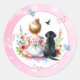 Sticker Rond Une petite fille et son Baby shower de chiot