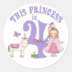 Quatrième anniversaire princesse mignonne en rose, avec Unicorne, grenouille et papillon, avec le texte "Cette princesse est 4" en violet.