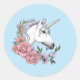 Sticker Rond Unicorne blanche Fleurs roses Mariage bleu