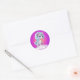 Autocollant rond rose vif avec une licorne debout sur un nuage avec un ciel émergeant avec des étoiles derrière. Cet autocollant sans texte spécifique est polyvalent et peut être utilisé pour la plupart des événements et la vie quotidienne. Disponible en différentes tailles. Diffusez de l'amour à la licorne.