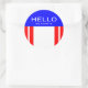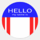 Autocollant rond avec le texte traditionnel "Bonjour mon nom est" sur un arrière - plan de design rouge, blanc et bleu pour une introduction amusante et unique lors de réunions ou d'événements patriotiques ou politiques américains. Trouvez un assortiment de bonjour unique mon nom est autocollants dans ce magasin. Variations personnalisées disponibles, cliquez simplement sur le bouton de magasin de contacts.