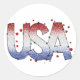 L'autocollant patriotique présente l'art des mots "USA" avec du texte rouge, blanc et argent glittery, et ajoute des étoiles brillantes rouges.