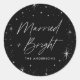 Des autocollants de vacances modernes avec "Marié et brillant" affichés dans un script écrit à la main, cerné par une bordure d'étoiles blanches contre un arrière - plan noir. Personnalisez les autocollants mariés et brillants en ajoutant vos noms ci-dessous. Les autocollants fonctionnent très bien comme les scellés d'enveloppe, pour sceller les sacs de faveur, et plus encore!