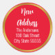 Un élégant script blanc se trouve en haut. Vous pouvez modifier le script si vous le souhaitez (indiqué : Nouvelle adresse). Trois lignes de texte non-script sont sous le script. Vous pouvez les modifier pour afficher votre nom et votre nouvelle adresse. L'autocollant est rouge vif. La bordure en or n'est pas du papier peint.